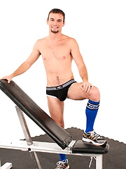 Horny athlete Nestor strokes dick in a gym