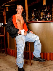 Bald skin Tom Taylor naked in a bar