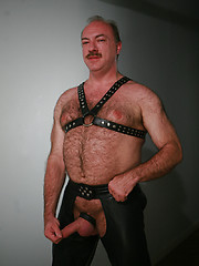 Jeremy Todd in a lether gear strokes his uncut mature cock