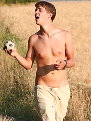 Twink boy Matt posing naked in the middle of a field.