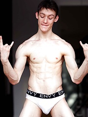 Hunky gay Jay Cruz shows off his strong muscles & his shaved dick